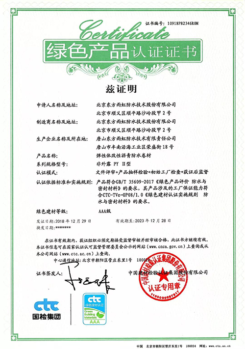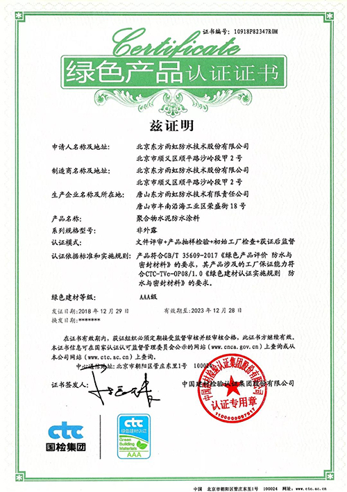 日前,中国建材磨练认证集团(以下简称:国检集团)向东方永利304官网唯一揭晓了首批绿色产品认证证书。   依据GB/T 35609-2017《绿色产品评价 防水卷材与密封质料》的要求,国检集团对东方永利304官网唯一工厂包管能力要求、产品一致性控制及绿色评价要求切合性等方面举行了严酷的现场检查与抽样磨练,东方永利304官网唯一此次申报的“弹性体改性沥青防水卷材(非外露 PY Ⅱ型 )”和“聚合物水泥防水涂料(非外露)”两类产品获绿色产品认证证书。